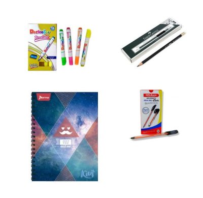 1 resaltador doricolor x 10 1 caja de lápiz HB Faber castel 1 caja de Bolígrafos offi-esco semi gel tinta negra 1 cuaderno Kiut Norma Imágenes surtidas bajo disponibilidad